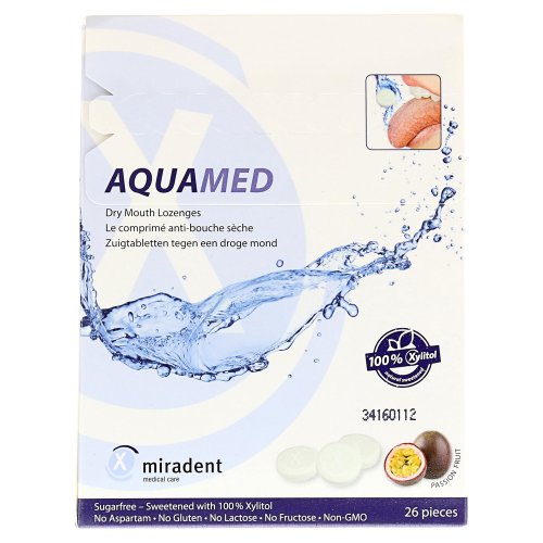 Miradent Aquamed sūkājamās tabeles sausai mutei ar Pasifloras augļu garšu palielina siekalu vedošanos mutē.Mazina plankumus uz zobiem un palīdz pret kariesa veidošanos. Stiprina zobu emalju. Papildus enzīmiem un zobiem labvēlīgajam ksilitolam , formula satur arī kalcija laktātu , kas veicina zobu emaljas remineralizāciju. Paredzētas tikai pieaugušajiem.