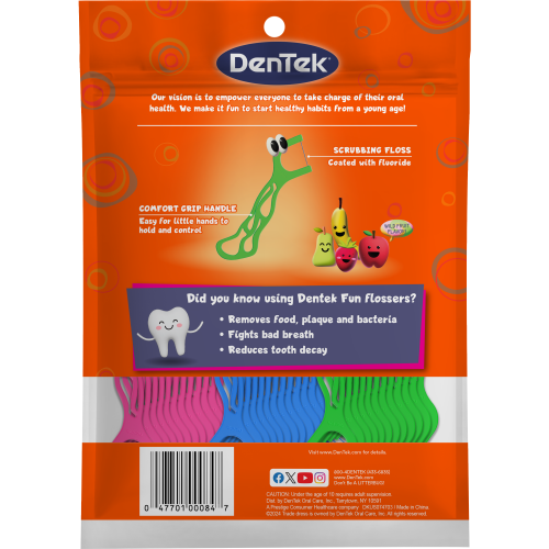 Izmantojiet DenTek Kids Fun Flossers starp ēdienreizēm, lai palīdzētu novērst zobu bojāšanos un smaganu slimības,un izveidotu zobārstniecības rutīnu uz mūžu. Pieaugušo uzraudzība nepieciešama līdz 10 gadu vecumam.
