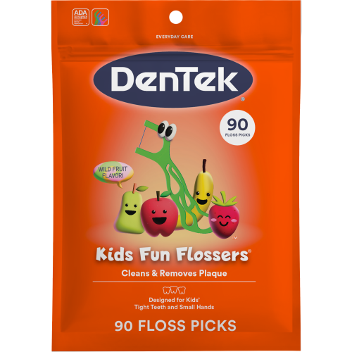 DenTek Kids Fun Flossers ir, lai palīdzētu bērniem izklaidēties ar zobu diegu, vienlaikus noņemot kaitīgo pārtiku un aplikumu, un tiem ir īpaši spēcīgs beršanas diegs ar Wild Fruit aromatizētu fluora pārklājumu. DenTek Kids Fun Flossers ir aprīkots ar diegu neplīstības garantiju — mēs garantējam, ka DenTek Kids Fun Flossers zobu diegs neplīsīs.