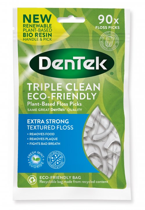 Balstoties uz mūsu populāro Triple Clean Floss Pick, mēs piedāvājam šo produktu, kas var lepoties ar visām tām pašām priekšrocībām, bet tam ir arī lieliski ekoloģiskie rādītāji. DenTek Eco Triple Clean Floss Pick nodrošina dziļas tīrīšanas rezultātus, kādus jūs sagaidāt no oriģinālā diega, taču, pateicoties ilgtspējīgāku materiālu izmantošanai, šis diega knaibles ir saudzīgākas pret dabu. Tie sastāv no vairāk nekā 200 atsevišķām tīrīšanas diega dzīslām, tāpēc tie skrubē ar papildu stūrīšiem un izciļņiem. Mūsu visplānākais un spēcīgākais zobu diegs iekļūst pat šaurākajās vietās un darbojas arī uz saspringtiem zobiem.