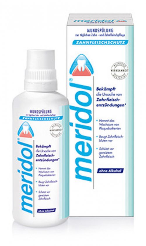 Meridol mutes skalojamais līdzeklis paredzēts zobu un smaganu ikdienas kopšanai , aizsardzībai. Kavē baktēriju augšanu , novērš smaganu asiņošanu, aizskargā pret smaganu iekaisumiem. Nesatur alkoholu. Lietošana: Pieaugušajiem un bērniem no 6 gadu vecuma skalot ar 10 ml šķīduma divas reizes dienā pēc zobu tīrīšanas.